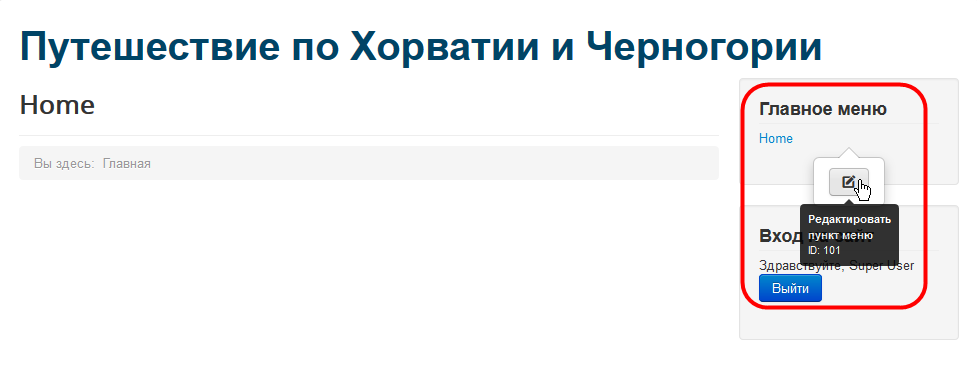 Что мы делаем? Мы редактируем пункт меню прямо с фронтальной части сайта! В открывшейся вкладке или окне (зависит от настроек браузера) правим заголовок пункта меню.