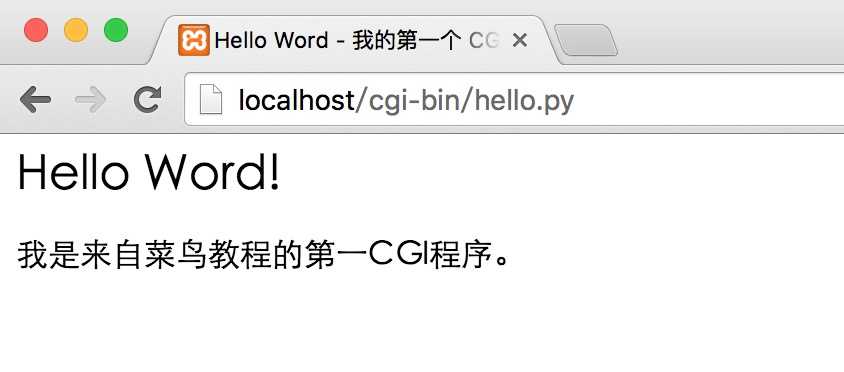 #!/usr/bin/python # -*- coding: UTF-8 -*- print "Content-type:text/html" print # 空行,告诉服务器结束头部 print '<html>' print '<head>' print '<meta charset="utf-8">' print '<title>Hello Word - 我的第一个 CGI 程序!</title>' print '</head>' print '<body>' print '<h2>Hello Word! 我是来自本教程的第一CGI程序</h2>' print '</body>' print '</html>'