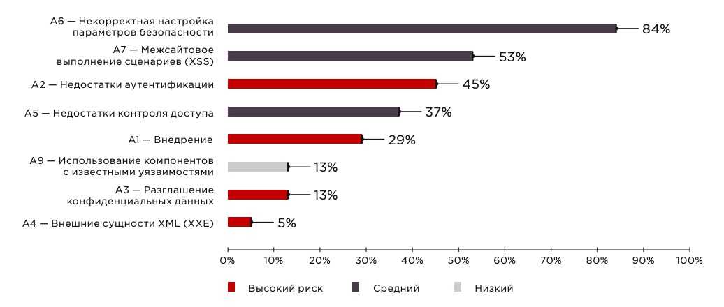Рисунок 6. Наиболее распространенные уязвимости из списка OWASP Top 10 (доля приложений)