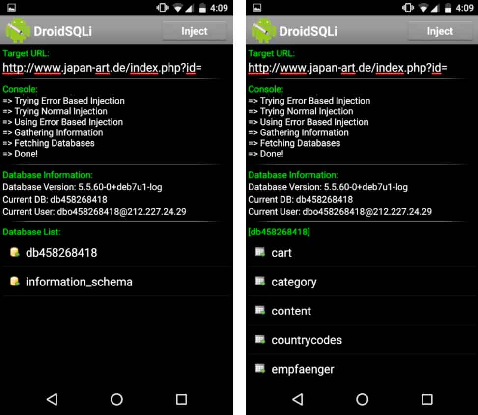 Следующая хакерская программа для Android — это DroidSQLi. Приложение DroidSQLi служит для проверки веб-сайтов на уязвимость к SQL-инъекциям четырех разновидностей: