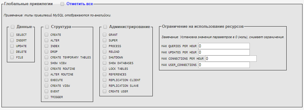 Пока ни одна галочка не отмечена — поставьте ее на пункт «Данные». Так можно будет оперировать существующими данными, но нельзя будет создать новую таблицу или удалить старую. Так вы защититесь в том числе и от атаки с помощью команды DROP, которая может удалить все статьи или комментарии с сайта.