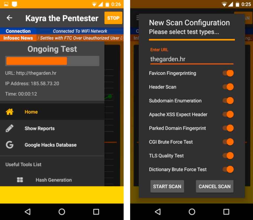Мобильный сканер уязвимостей веб-приложений Kayra the Pentester Lite ищет типичные ошибки в конфигурации указанного веб-сервера и пытается получить листинг каталогов (обычно — успешно). Среди дополнительных инструментов есть генератор хешей и дешифровщик AES.
