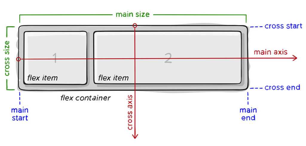 Если «обычная» компоновка основана на блочном (block) и линейном (inline) направлениях потока, гибкая компоновка основана на «направлениях гибкого потока (flex-flow directions)». Пожалуйста, посмотрите на этот рисунок из спецификации, объясняя основную идею гибкого макета.