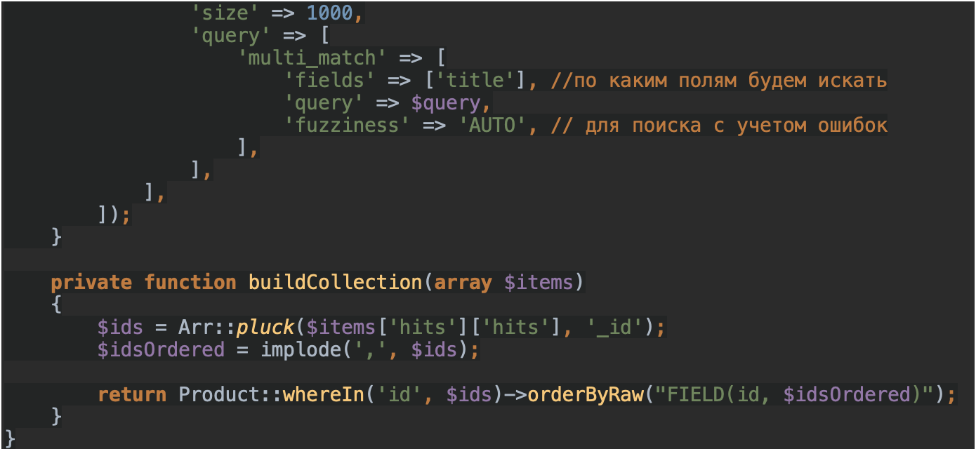 Elasticsearch уже возвращает результат по релевантности, в методе buildCollection берем все id записей, и сортируем их в запросе в том же порядке, как вернул эластик.