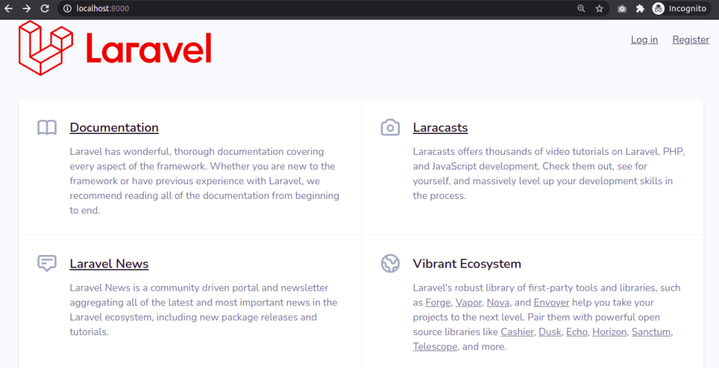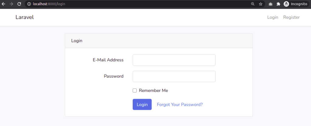 After that, you can test the application. As a result, we have the Login and Register option provided by the Laravel UI.