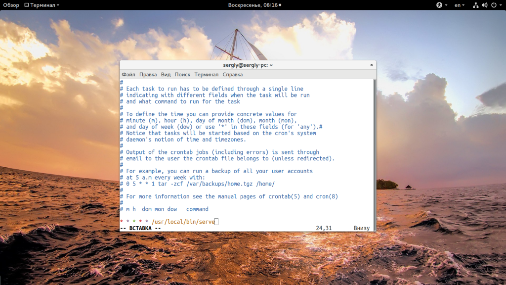 Давайте предположим, что нам нужно запускать от имени суперпользователя наш скрипт по адресу /usr/local/bin/serve. Какой-нибудь обслуживающий скрипт. Самый простой пример — запускать его каждую минуту: