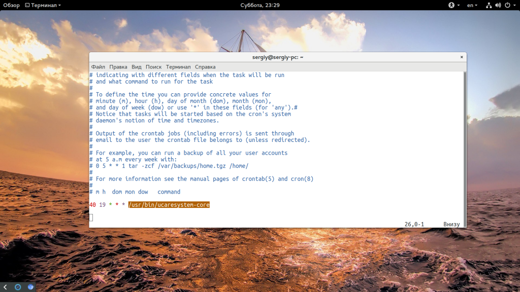Для настройки времени, даты и интервала когда нужно выполнять задание используется специальный синтаксис файла cron и специальная команда. Конечно, вы всегда можете отредактировать файл /etc/crontab, но этого делать не рекомендуется. Вместо этого, есть команда crontab:
