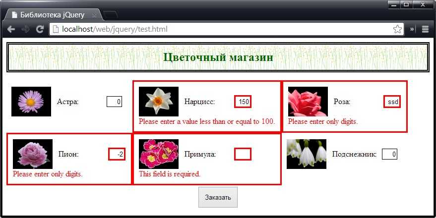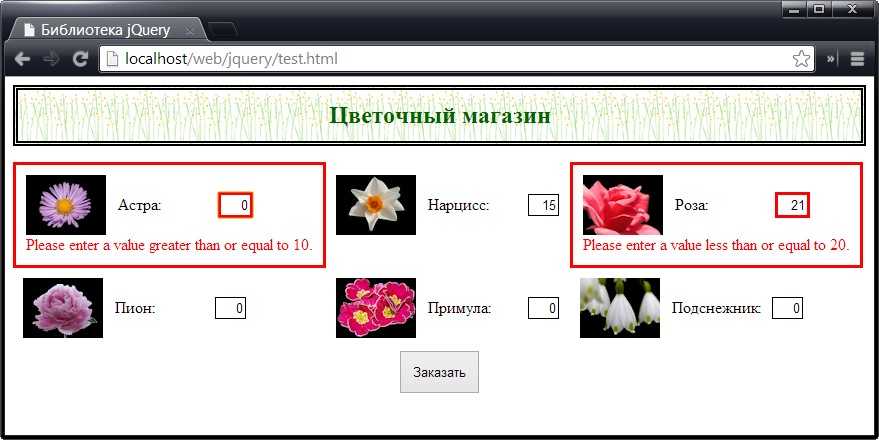 Правила, применяемые к элементам с использованием методов rules(), интерпретируются до того, как будут интерпретироваться правила, применяемые с использованием классов. В контексте нашего примера это означает, что элементы верхнего ряда будут проверяться с использованием значения min, равного 10, и значения max, равного 20, в то время как к другим элементам input будут применяться соответственно значения 0 и 100. Результат представлен на рисунке: