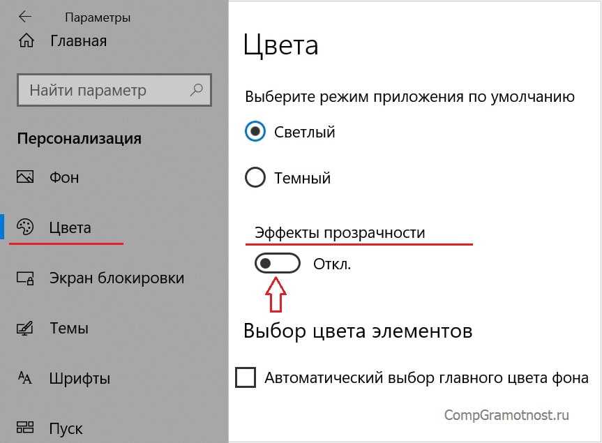 5) В «Цветах» скролим окно, чтобы обнаружить раздел «Эффект прозрачности» (показан цифрой 2 на рисунке 3). Кликаем по нему один раз. После этого рычаг переводится в положение «Выключено», как видно ниже на рис. 4.