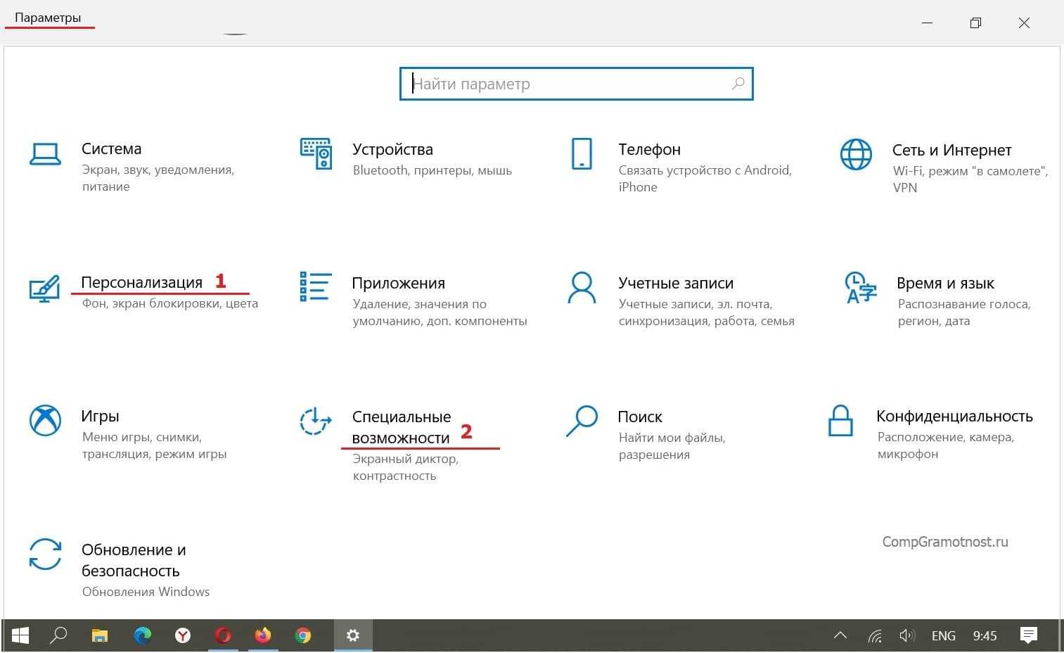Рис. 2 (Кликните для увеличения). В «Параметрах» Windows 10 находятся опции «Персонализация» и «Специальные возможности».