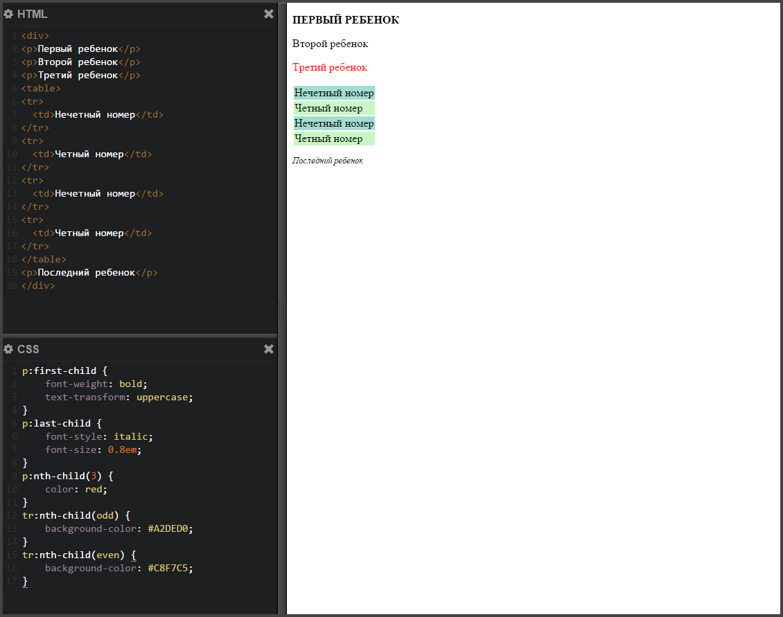 - :nth-child – позволяет выбрать четные (even) и нечетные (odd) дочерние элементы; также с помощью данного псевдокласса можно стилизовать чередующиеся дочерние элементы, используя выражения вида an+b и числа;