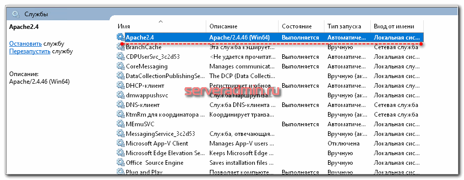 Переходим в оснастку windows Службы и запускаем Apache2.4.