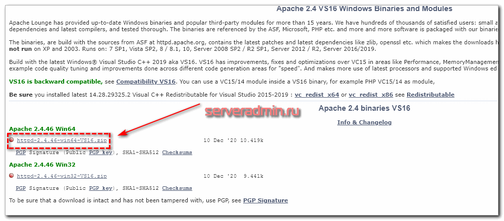 Теперь устанавливаем apache 2.4. С ним опубликовать базы 1С проще и быстрее, чем с iis. Качаем apache отсюда — https://www.apachelounge.com/download/