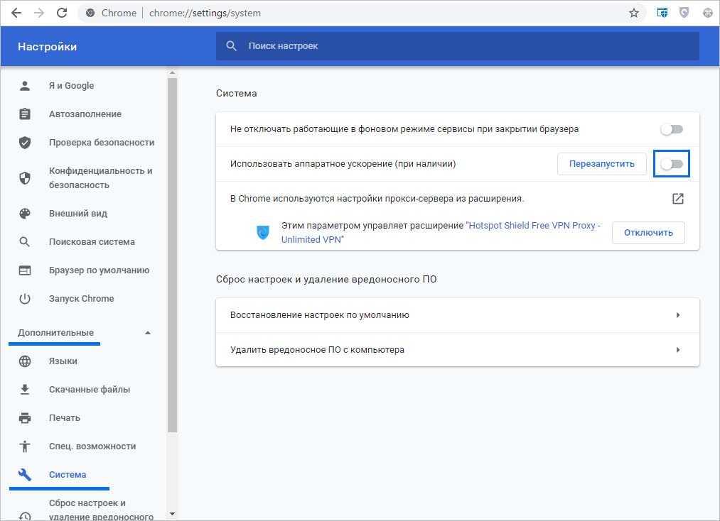 В меню слева перейдите на вкладку Дополнительные, затем в раздел Система. В списке доступных опций найдите запись «Использовать аппаратное ускорение (при наличии). Эта опция включена по умолчанию. Переместите переключатель в положение «Отключено» и нажмите на кнопку «Перезапустить». После отключения аппаратного ускорения изображение не должно быть размытым.