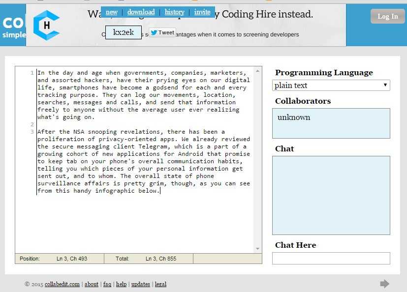 collabedit можно использовать для редактирования с друзьями исходного кода различных языков программирования в режиме реального времени. Если вы хотите создать простой текстовый файл, отредактировать C ++ код, Java, JavaScript, SQL, Python, Ruby, Pascal и т.д., этот сайт очень удобен.