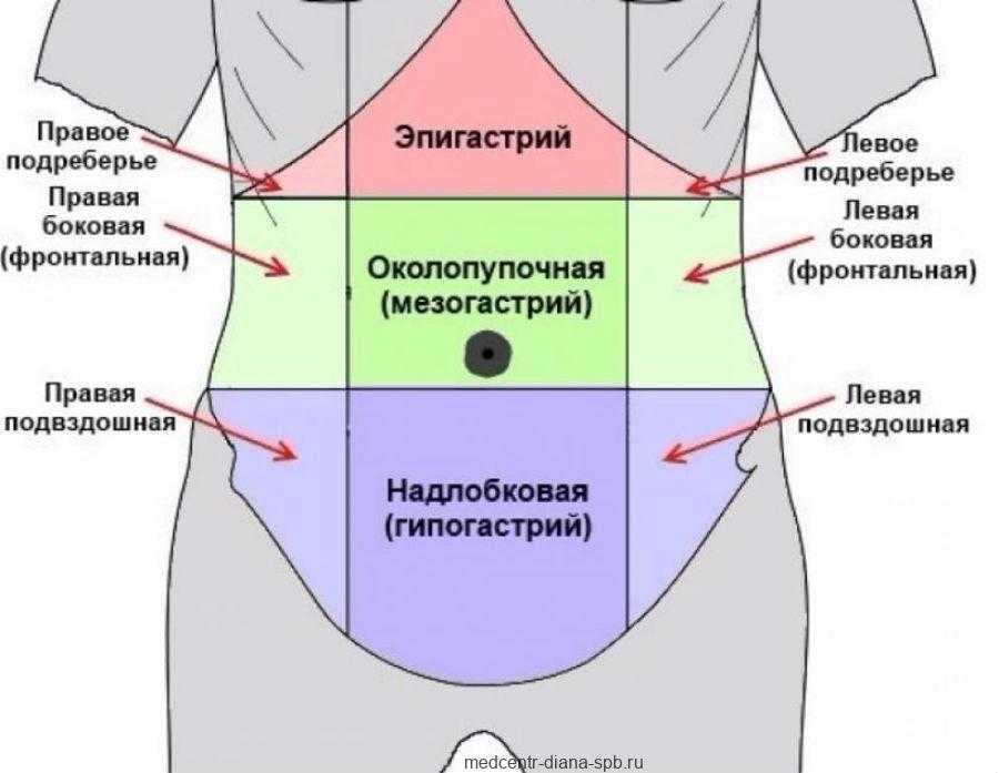 Визуально разделите живот на 9 квадратов. Пронумеруйте каждую ячейку (область живота) следующим образом: области 1-3 находятся в верхнем ряду (1 справа, 2 в середине, 3 слева), области 4-6 включают средние квадраты, а области 7-9 образуют нижний ряд.