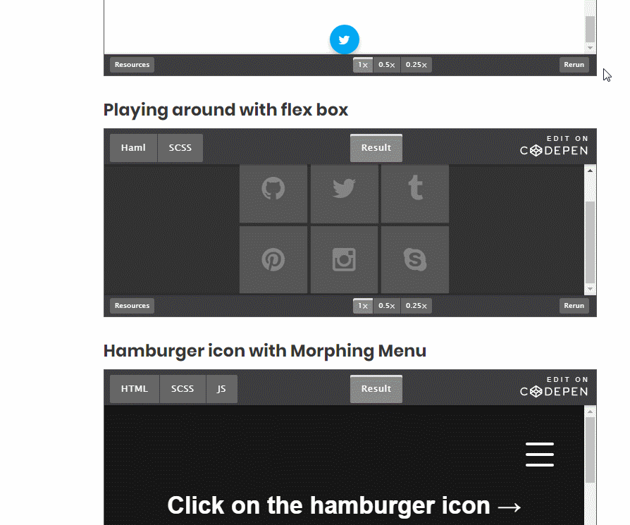 Варианты на сайте оформлены в удобных окошках: можно сразу посмотреть результат и скопировать варианты в HTML, SCSS, JS.