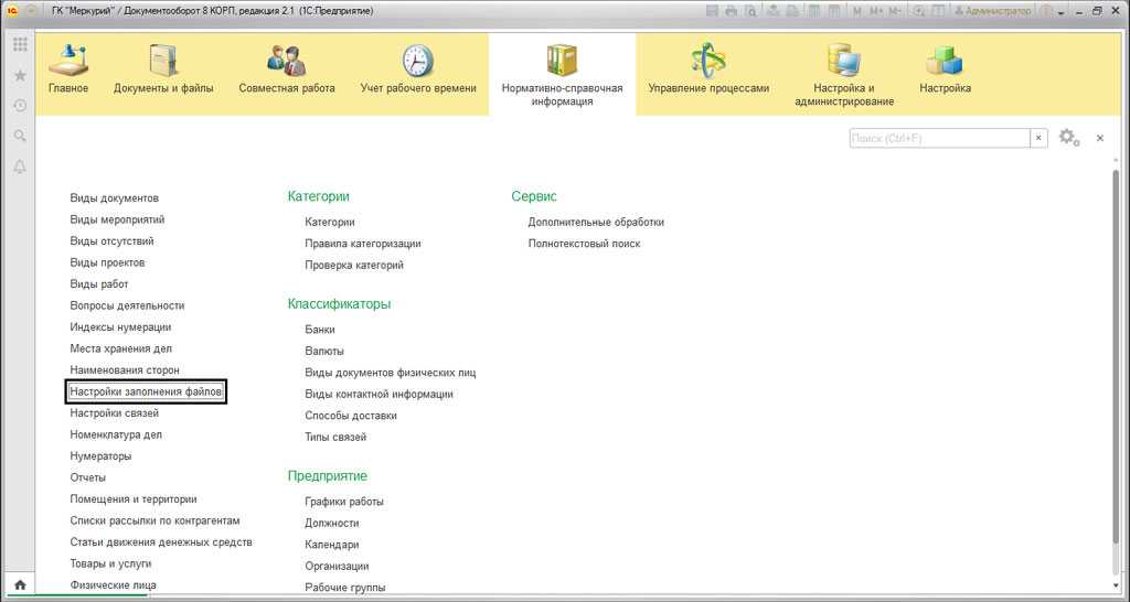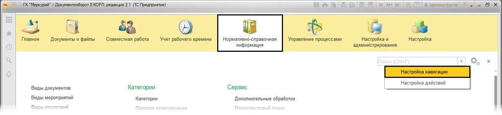 Для последующей настройки нам нужно перейти в раздел «Нормативно-справочная информация». В настройках выбираем «Настройка навигации». После чего выводим на рабочий стол меню, которого нет на рабочем столе.