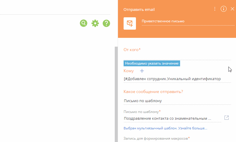 На заметку. Для работы с почтой в Creatio должна быть выполнена интеграция с почтовым провайдером. Убедитесь, что все пользователи, которые должны запускать процесс, имеют права доступа к почтовому ящику, указанному в поле От. Подробнее: Настроить права доступа на запись.