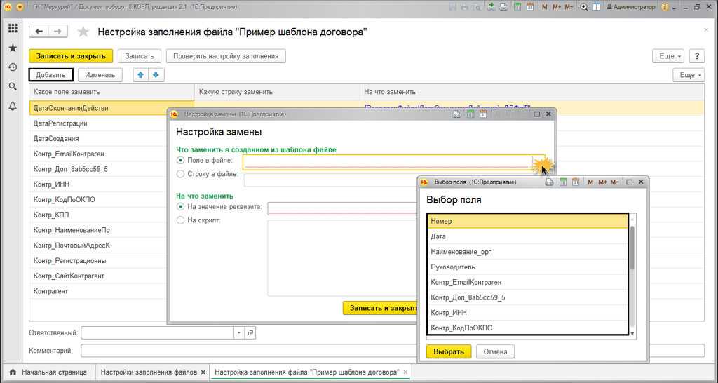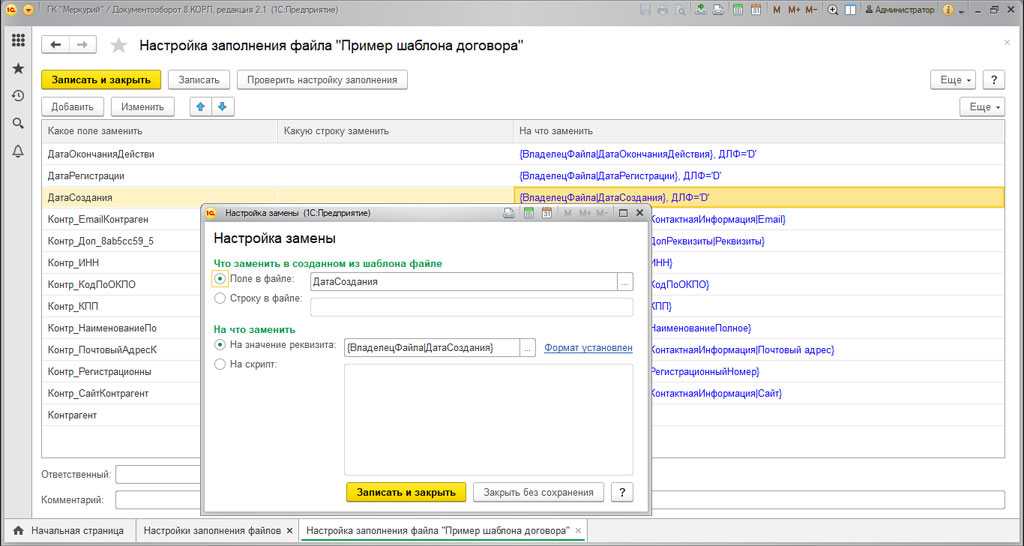 Дальше вводим нужные параметры замены. Реквизиты могут задаваться в виде выражений на встроенном языке, или к примеру в виде скрипта.