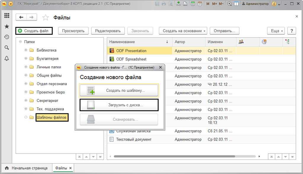 В появившемся окне, нажимаем на «Шаблоны файлов», скачиваем нашу новою заготовку, по нажатию кнопки «Создать файл». В следующем окне выбираем команду «Загрузить с диска».
