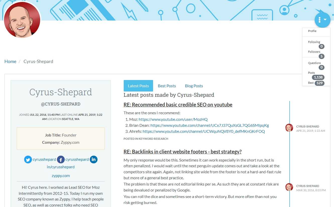 Пример страницы о Сайрусе Шепарде moz.com/community/q/user/cyrus-shepard
