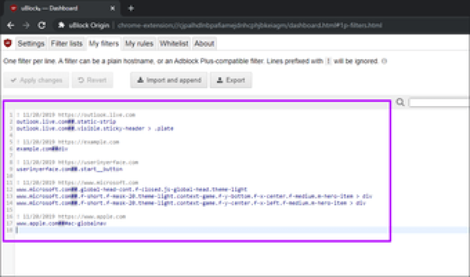 Вы также можете управлять заблокированными элементами с помощью панели управления uBlock Origin. Щелкните правой кнопкой мыши значок расширения uBlock Origin, щелкните Параметры, а затем щелкните Мои фильтры. Затем вы можете удалить ранее заблокированные элементы из списка фильтров.