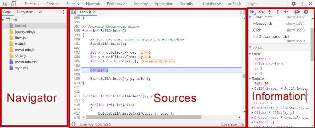 - Sources – отображается исходный код, тот его фрагмент, где находится команда debugger.