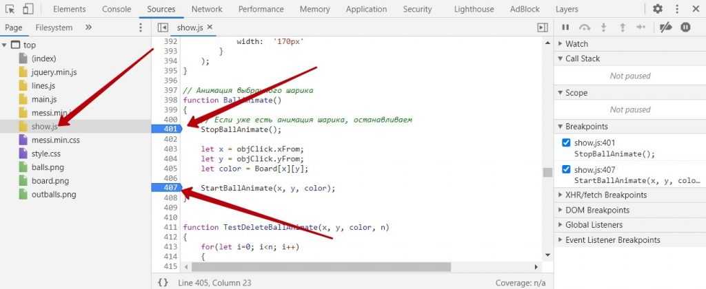 Кроме использования команды debugger, остановить выполнение скрипта в определенном месте можно при помощи так называемых breakpoints или точек останова.