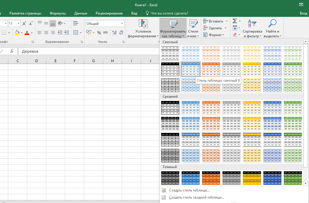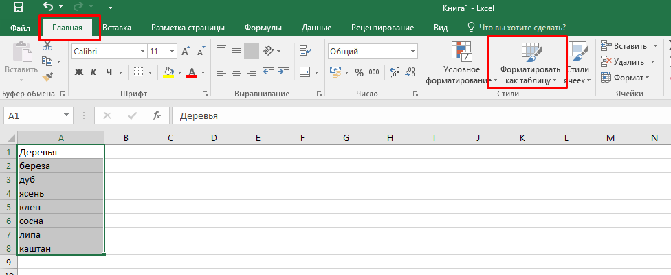 - Выделите левой кнопкой мышки диапазон для списка (в данном примере это будет перечень деревьев), затем откройте вкладку «Главная» и выберите меню «Форматировать как таблицу».