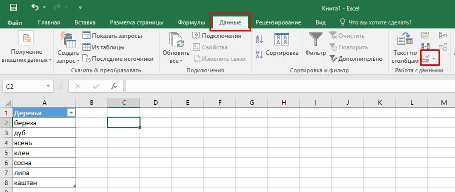 Если удалить ячейку (в данном случае мы удалили «берёза»), это тоже отобразится на содержании раскрывающегося списка.