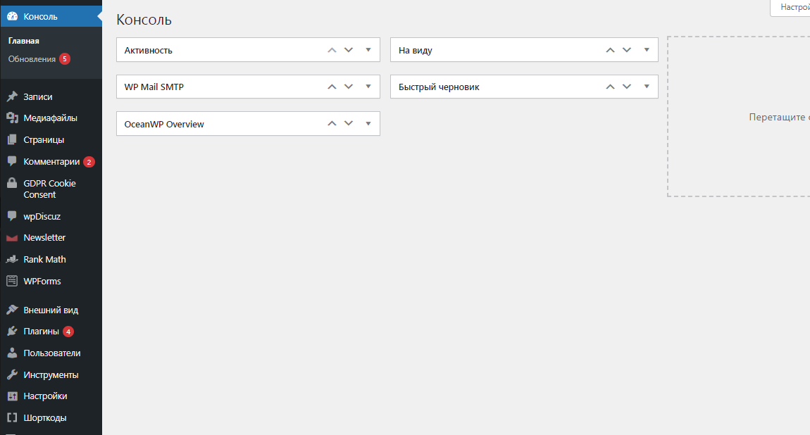 Здесь можем настроить свой сайт так, как нам необходимо и начать работать, т.е., размещать необходимую информацию.