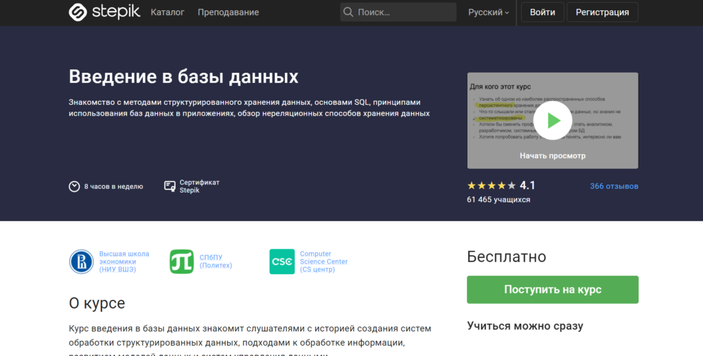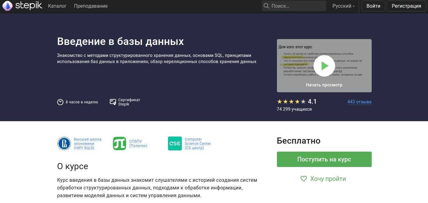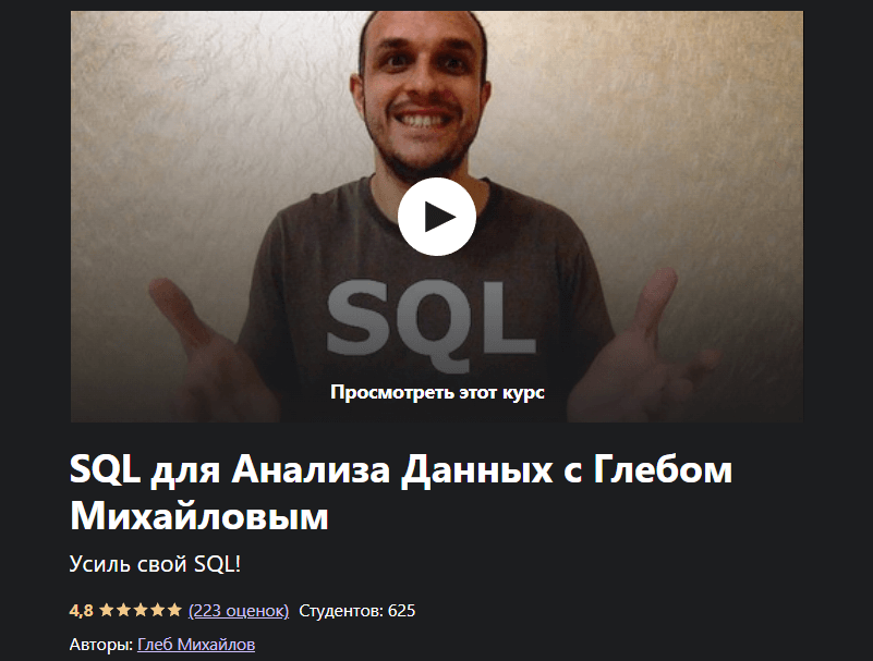 Если ты знаешь Python, то обязательно обрати внимание на этот курс. Здесь изучение SQL проходит в связке с этим языком программирования в Jupiter и Google Colab