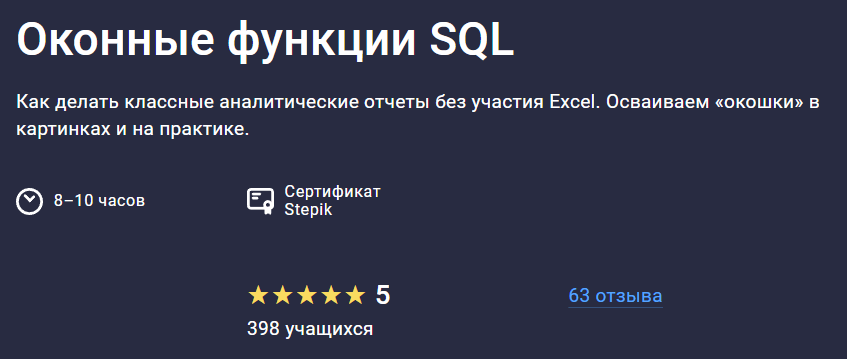 Если ты уже немного знаком с SQL и хочешь улучшить свои знания, то обрати внимание на этот курс. С его помощью ты освоишь работу с оконными функциями SQL