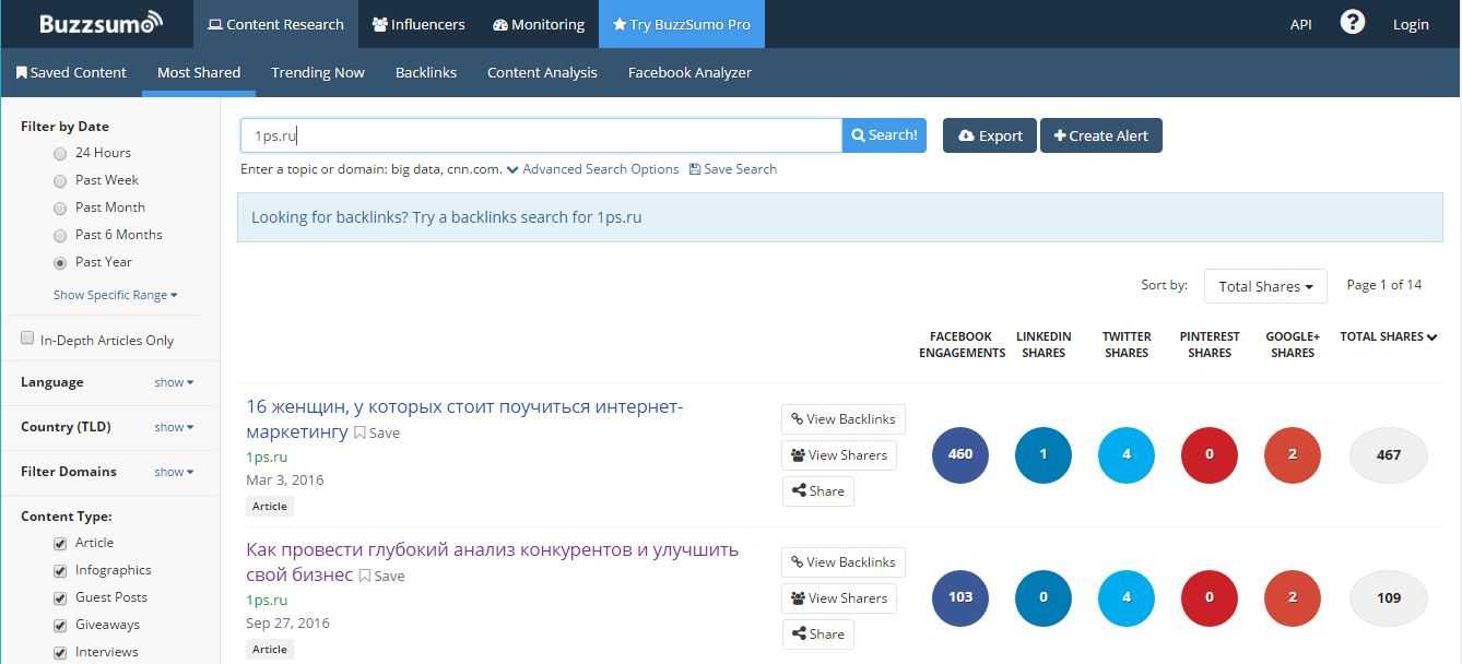 Англоязычный сервис, который показывает, какой контент вашей компании пользуется популярностью. Показывает частичные отчеты в демо-версии. Также есть возможность мониторинга упоминаний в сети от 99 долларов в месяц. Подходит международным компаниям, отлично работает и на русскоязычный рынок.