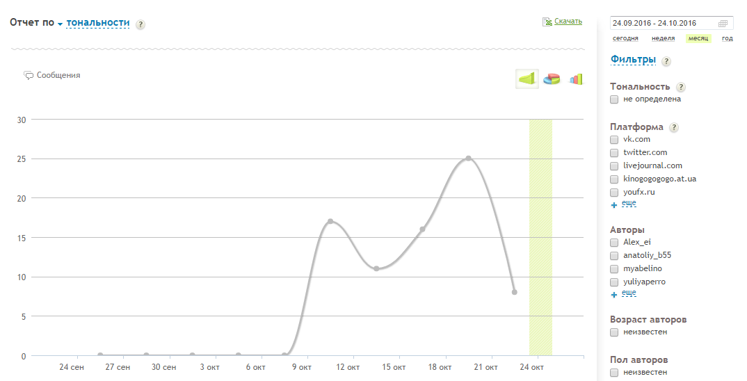 Еще одна система мониторинга с хорошей функциональностью. Сервис автоматически определяет тональности отзывов, показывает наглядные графики и формирует отчеты. Кроме этого, его можно интегрировать с CRM-системами. Первые 7 дней сервисом можно пользоваться бесплатно, потом цена составит от 7 900 рублей в месяц.
