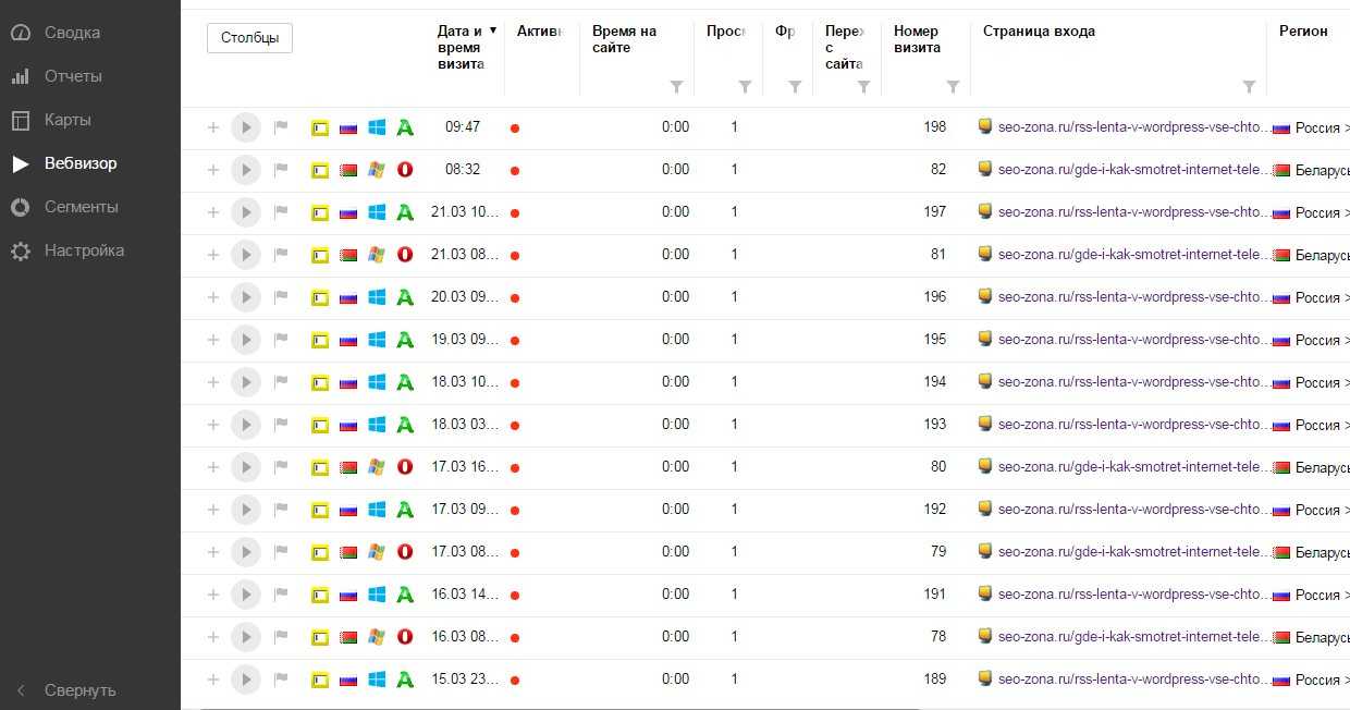 Смотрите сами скрин (обратив внимание на колонку «Номер визита» и «Страницу входа»: