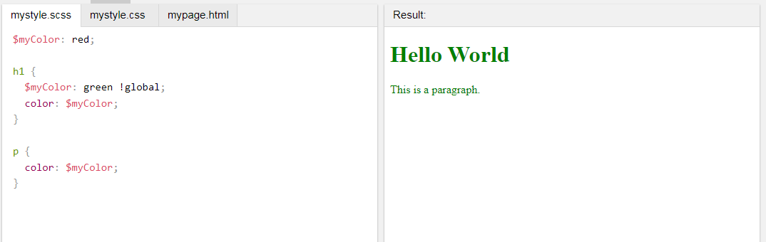$myColor: red;h1 {$myColor: green !global;color: $myColor;}p {color: $myColor;}